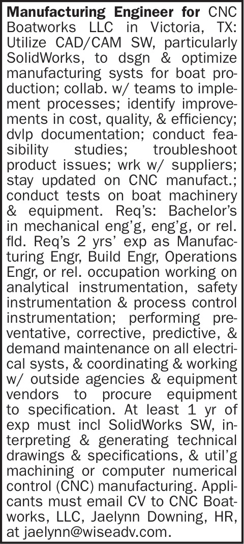 Nov 01, 2025. CNC Boatworks LLC Jobs from Victoria Advocate Jobs
