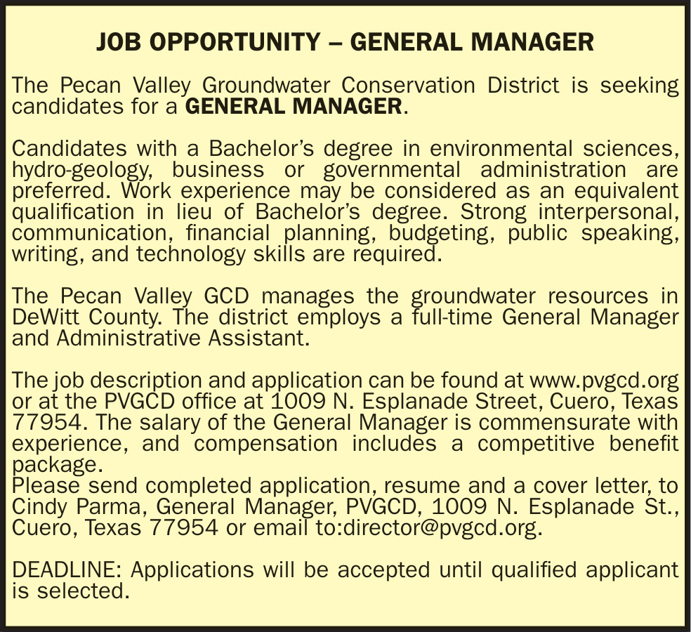 Apr 26, 2026. Pecan Valley Groundwater Conservation District Jobs from Victoria Advocate Jobs